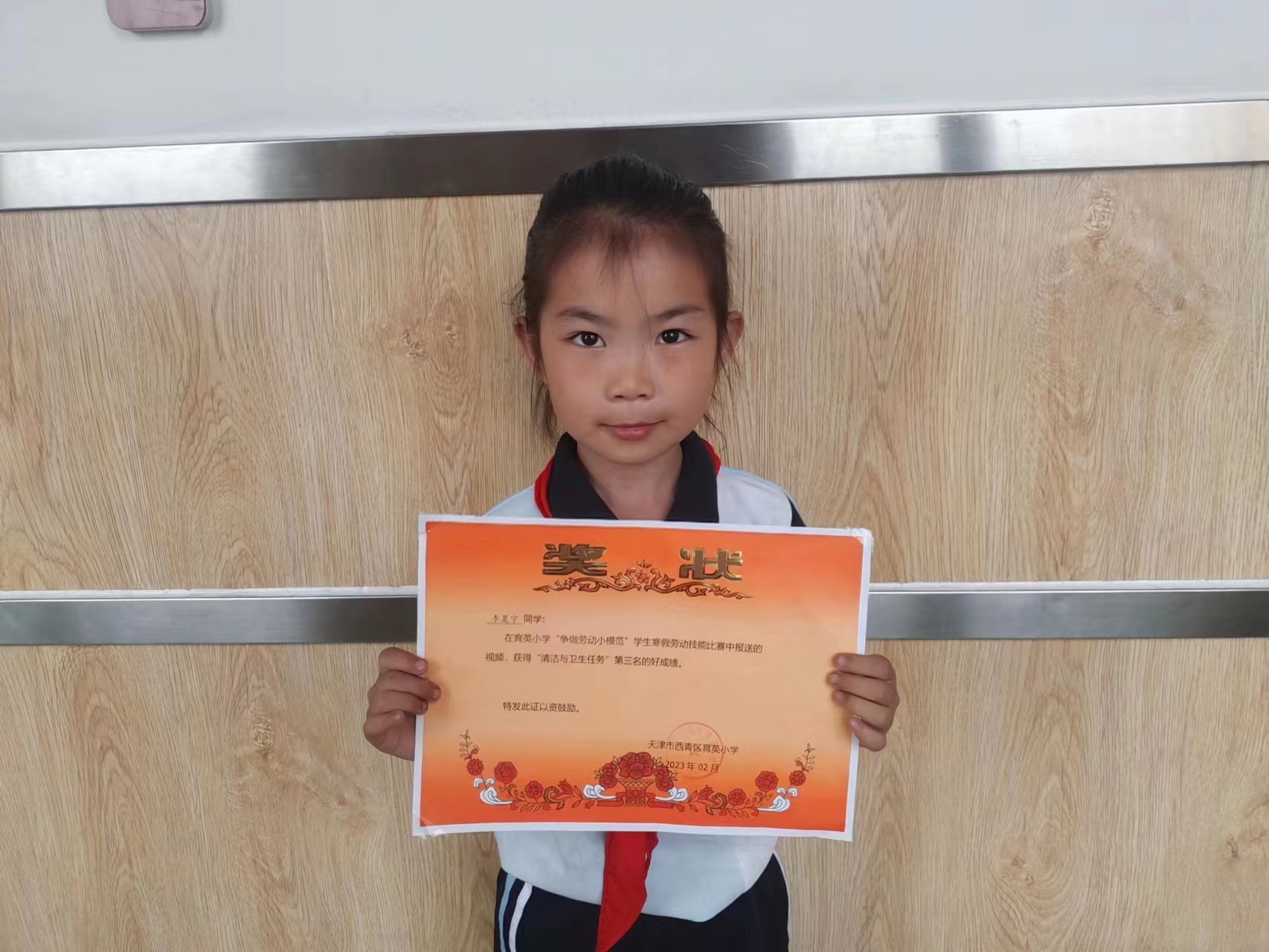 音体美劳颁奖,李夏宁同学获得劳动小模范。