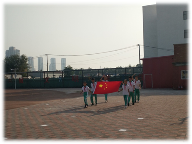 六名护旗手迈着整齐有力的步伐,护送国旗入场。伴随着国歌的响起,五星红旗冉冉升起,全体师生高唱国歌。少先队员行队礼,全体教师、一年级新生行注目礼。