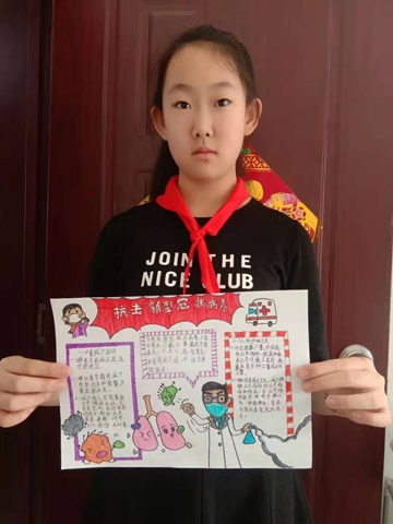 通过新闻,我们知道战斗在抗击疫情一线的叔叔阿姨们是多么的伟大!作为新时代的一名少先队员,我们愿意用自己一份小小的力量,为抗击疫情的“战士们”和正在与病魔斗争的“勇士们”加油、鼓劲!