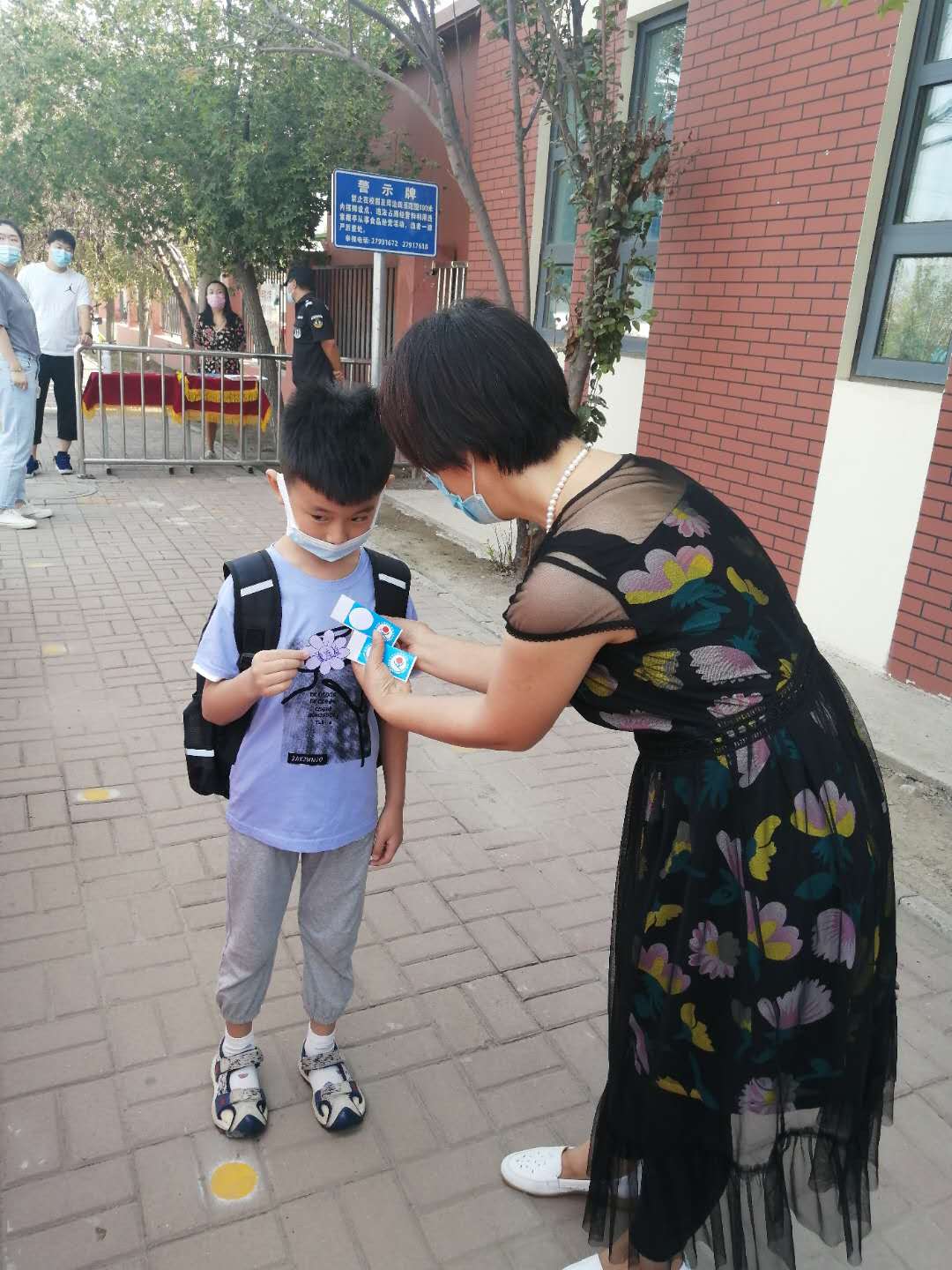 校领导亲手为孩子们佩戴校徽,欢迎大家成为育英小学的一份子。